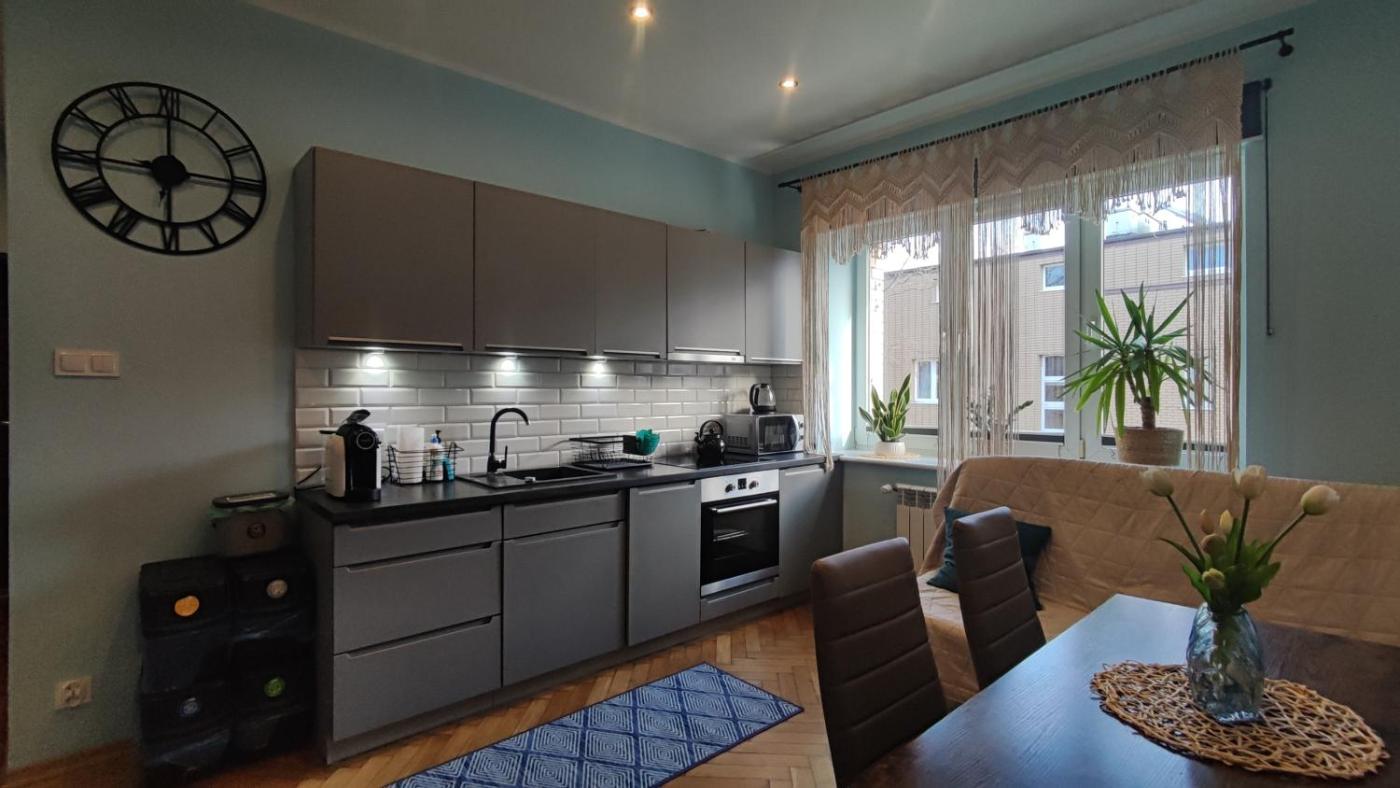 Kuchnia w apartamencie jest w pełni wyposażona, aby goście mogli swobodnie przygotowywać posiłki. Znajdziemy tu stół, ekspres do kawy, lodówkę, kuchenkę mikrofalową, a także pralkę i zmywarkę. Dzięki przyborom kuchennym oraz świeżym środków czystości, każdy poczuje się jak w domu 🍽️.