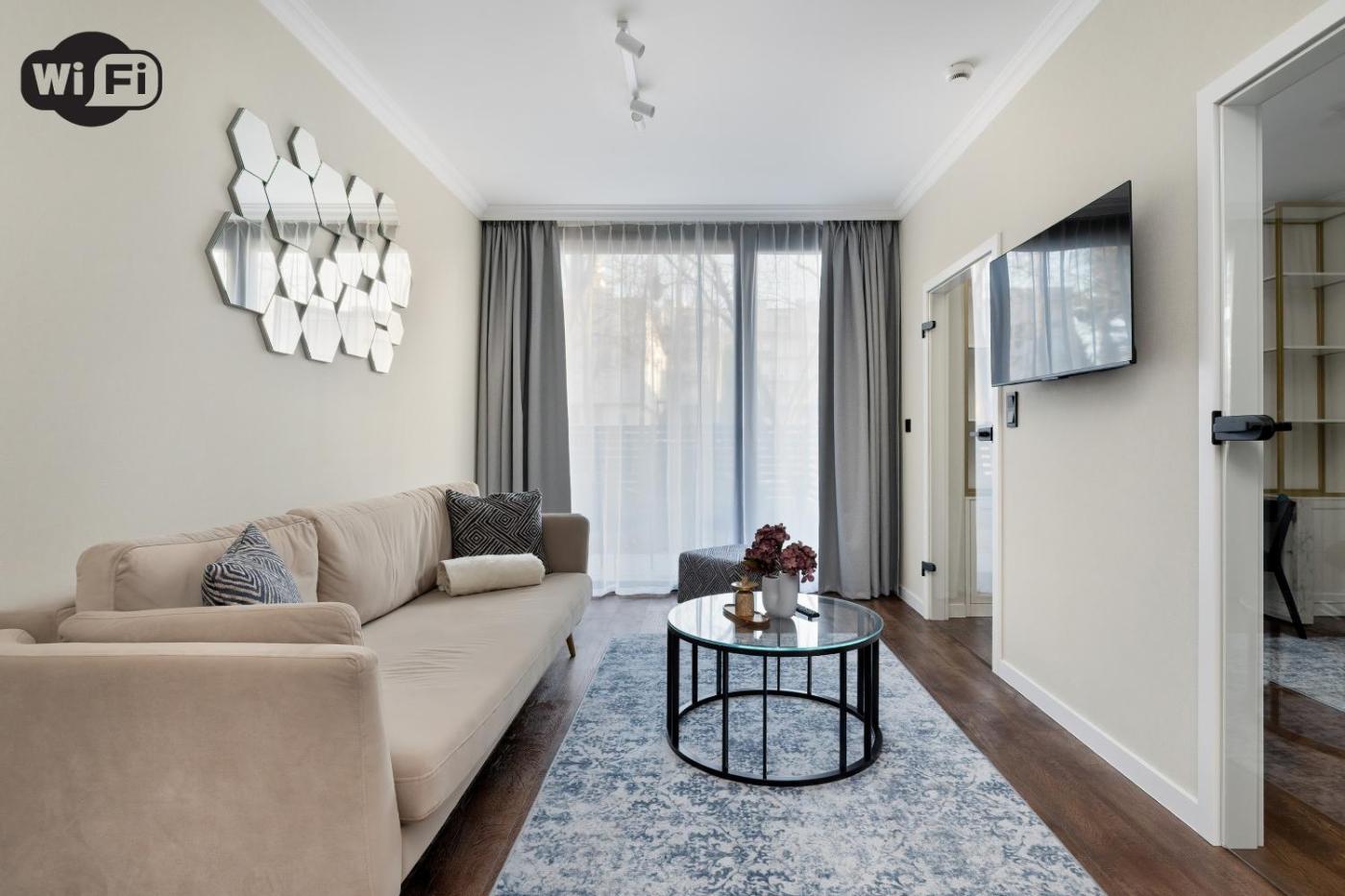 Apartament z 1 sypialnią. Boasting a private entrance, this air-conditioned apartment comes with 1 living room, 1 separate bedroom and 1 bathroom with a shower and a hairdryer. Guests can make meals in the kitchenette that features a stovetop, a refrigerator, a dishwasher and kitchenware. This apartment has a washing machine, a tea and coffee maker, a flat-screen TV and a patio. The unit has 2 beds. Apartament - 4 osobowy. Powierzchnia pokoju ok.: 44 mkw. ;